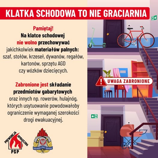 Straż pożarna apeluje do mieszkańców o przestrzeganie zasad bezpieczeństwa i usunięcie wszelkich zbędnych przedmiotów z klatek schodowych. Pamiętajmy, że bezpieczeństwo jest wspólną sprawą i zależy od odpowiedzialności każdego z nas.