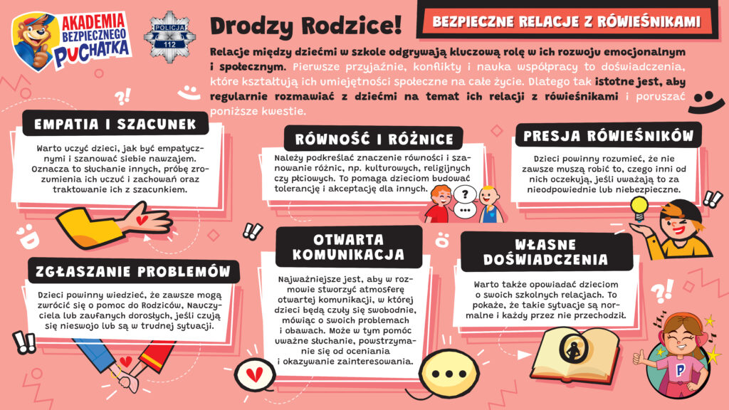 Jednym z przykładów inicjatyw wspierających dzieci w budowaniu zdrowych relacji jest Akademia Bezpiecznego Puchatka. Podczas zajęć dzieci uczą się rozpoznawania emocji, radzenia sobie w trudnych sytuacjach i rozwijania empatii – a także tego, jak być dobrym kolegą i koleżanką. Edukacja emocjonalna i społeczna w pierwszych latach nauki ma kluczowe znaczenie. Program promuje relacje oparte na szacunku, zrozumieniu i bezpieczeństwie.