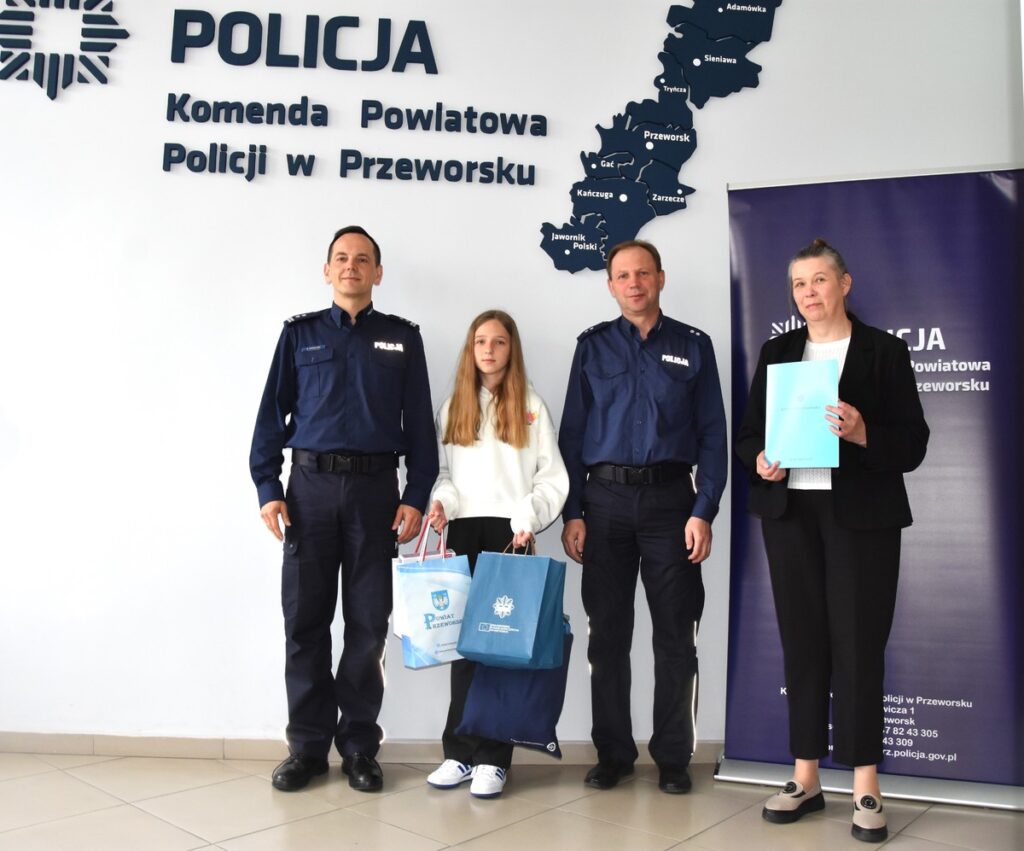 Dzisiaj, Komendant Powiatowy Policji w Przeworsku mł. insp. dr Bartłomiej Kowalski, w imieniu kierownictwa polskiej Policji oraz partnerów akcji przekazał nagrody i upominki. Podczas uroczystości uczennicy Szkoły Podstawnej w Dębowie towarzyszyli mama oraz opiekun. Nagrodę główną w konkursie w kategorii praca plastyczna (wiek 11-16 lat) otrzymała Amelia Zięba.