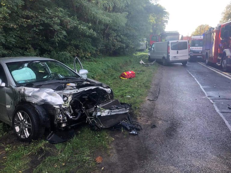 04.10.2021 r. miejscowość Dobra. Zderzenie osobówki z busem. Jedna osoba poszkodowa – relacjonuje Komenda Powiatowa Państwowej Straży Pożarnej w Przeworsku. zdj. st. sekc. Marek Cwynar.