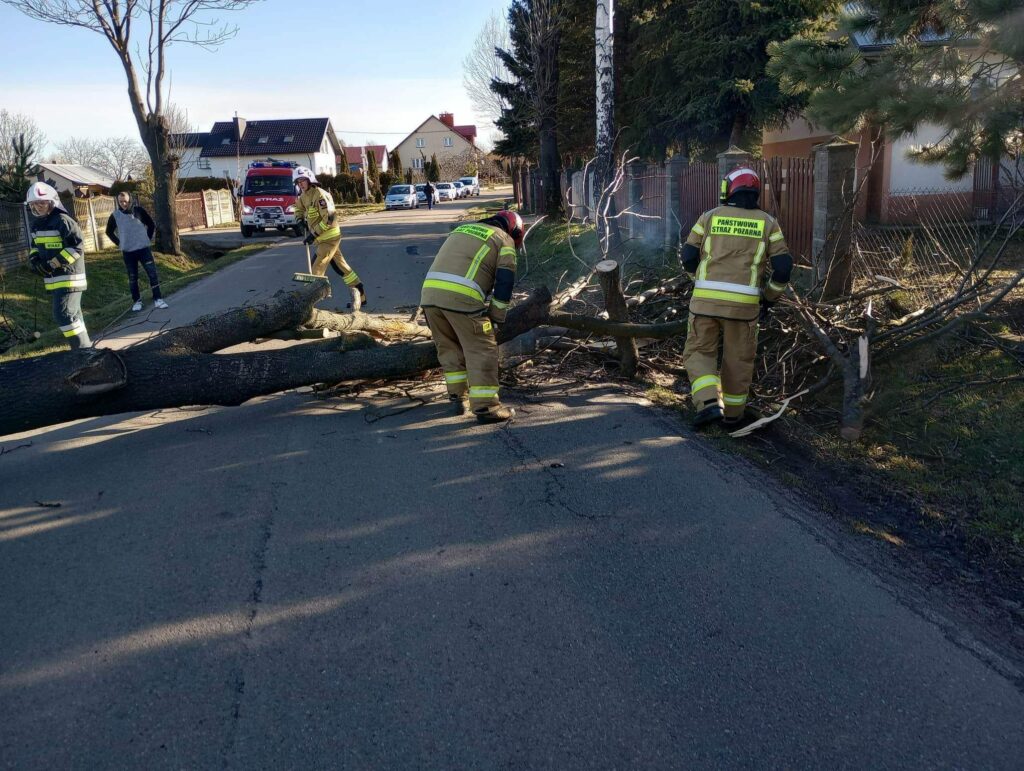 Przewrócone drzewo na drodze powiatowej, skutki silnego wiatru.