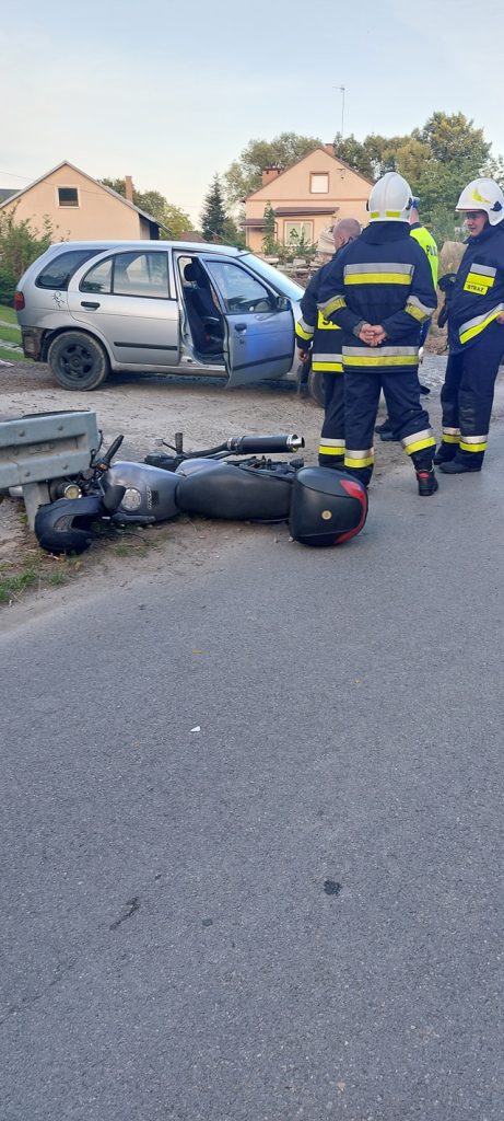 20.06.2024r. Siedleczka. Zderzenie samochodu osobowego z motocyklem. W wyniku zdarzenia jedna osoba została poszkodowana i przetransportowana przez ZRM do szpitala.