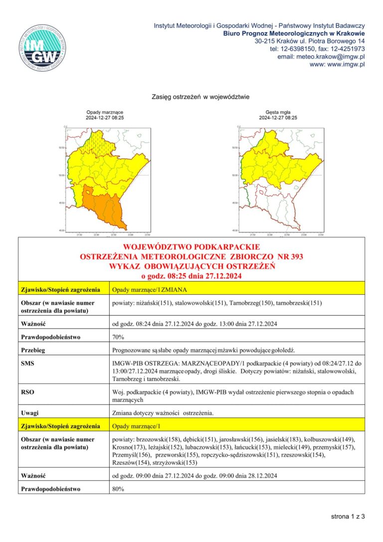 IMGW ostrzega od 27 grudnia br. 9:00 do 28 grudnia br. godz. 9:00 możliwe w regionie obejmującym m.in. powiat przeworski: Źródło: IMGW