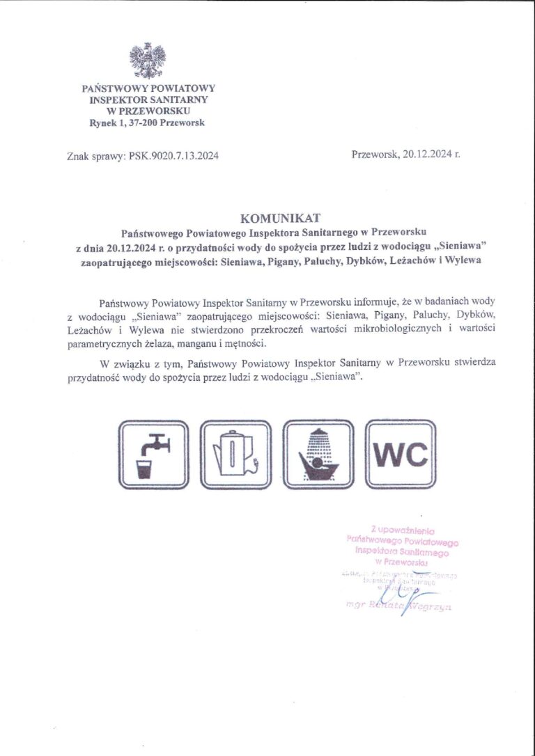 Gospodarka Komunalna Sp. z o.o. w Sieniawie udostępnia komunikat i decyzję PSSE w Przeworsku z dnia 20.12.2024 r. stwierdzającą przydatność wody do spożycia z wodociągu Sieniawa. Źrodło: UMiG Sieniawa