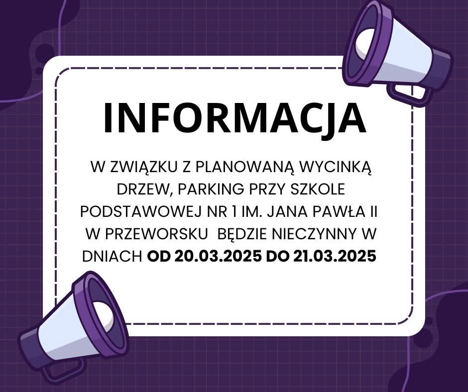 Ważna informacja dla mieszkańców Przeworska, a w szczególności dla rodziców uczniów Szkoły Podstawowej nr 1 im. Jana Pawła II. W związku z planowaną wycinką drzew, parking znajdujący się przy szkole będzie całkowicie wyłączony z użytku w dniach 20 i 21 marca 2025 roku.