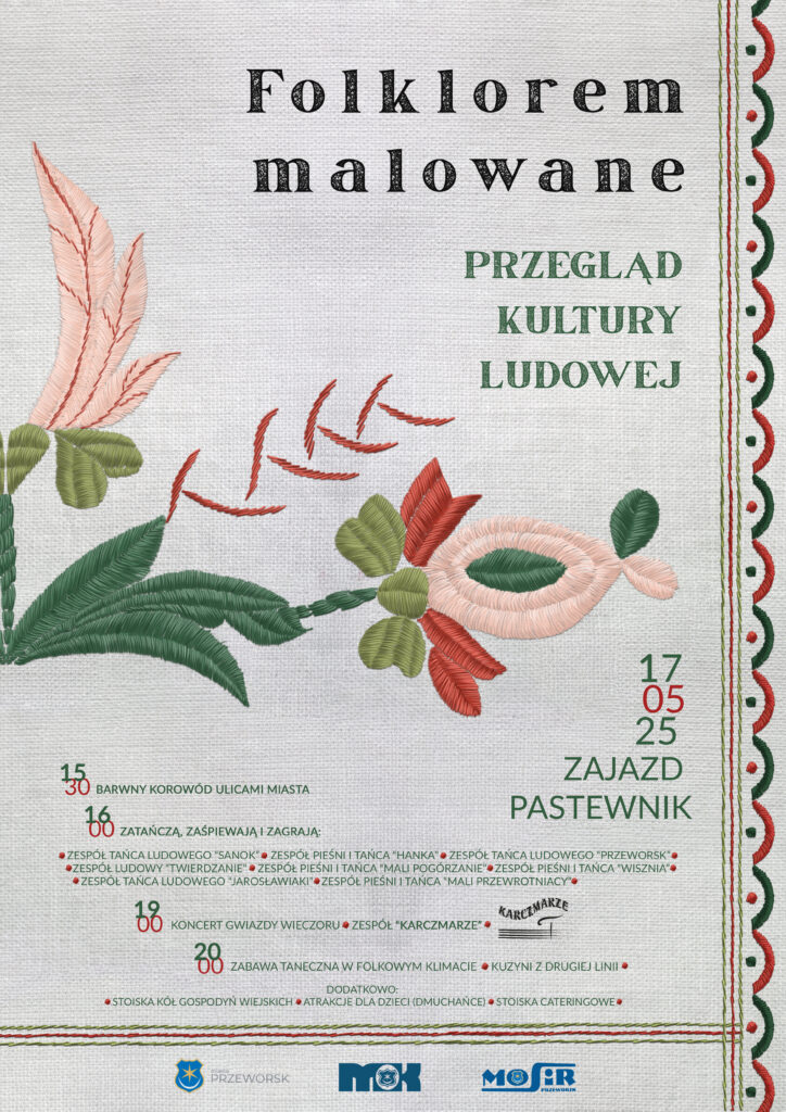 Już w sobotę, 17 maja 2025 roku, Przeworsk zamieni się w stolicę ludowej tradycji! Burmistrz Miasta Przeworska Leszek Kisiel, Miejski Ośrodek Kultury oraz Miejski Ośrodek Sportu i Rekreacji serdecznie zapraszają na wyjątkowy Przegląd Kultury Ludowej „Folklorem malowane”!