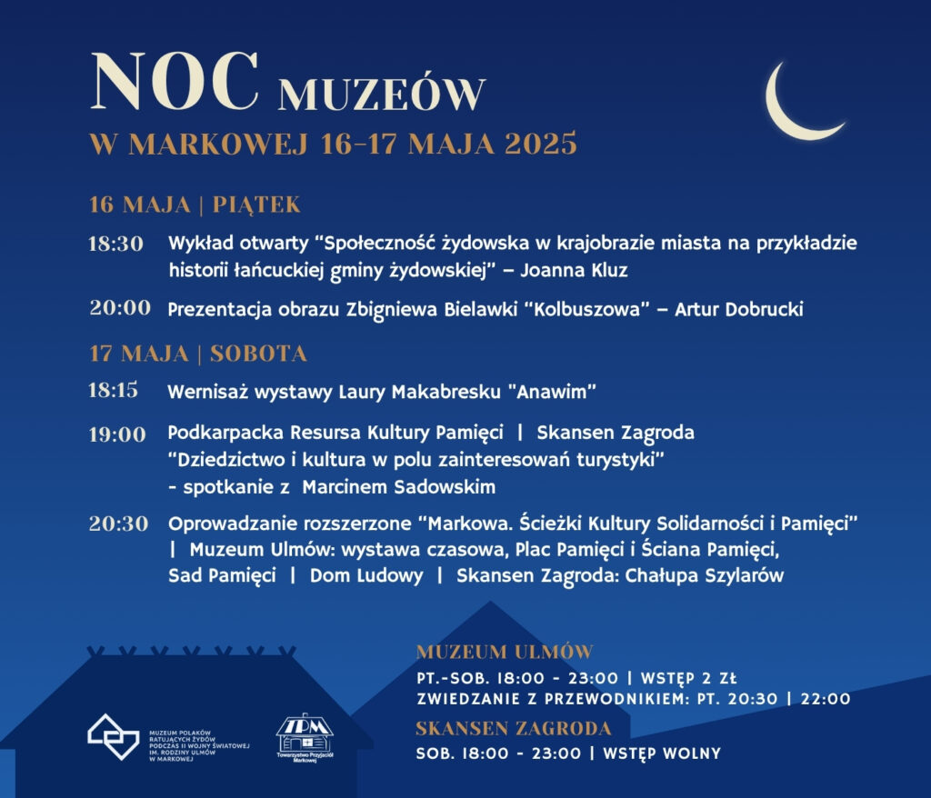 Muzeum Polaków Ratujących Żydów oraz Zagroda – Muzeum Wsi Markowa zapraszają na wyjątkową, dwudniową edycję Nocy Muzeów w Markowej, która odbędzie się w dniach 16-17 maja 2025 roku.