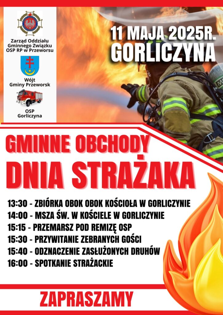 Zarząd Oddziału Gminnego Związku OSP RP w Przeworsku, Wójt Gminy Przeworsk oraz OSP Gorliczyna serdecznie zapraszają na Gminne Obchody Dnia Strażaka, które odbędą się w niedzielę, 11 maja 2025 roku w Gorliczynie.
