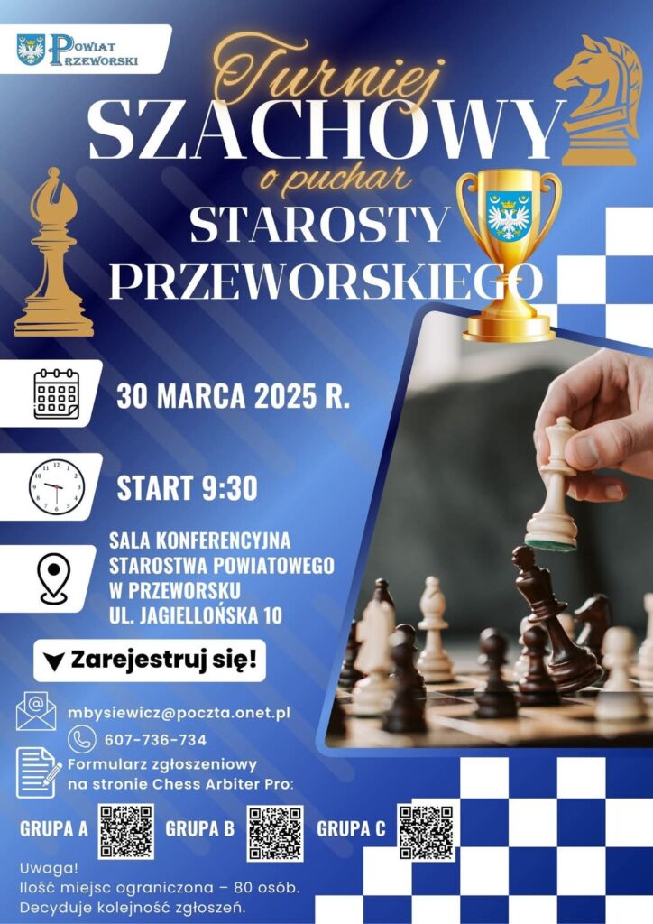 Zapraszamy na Turniej Szachowy o Puchar Starosty Przeworskiego, który odbędzie się 30 marca 2025 r.