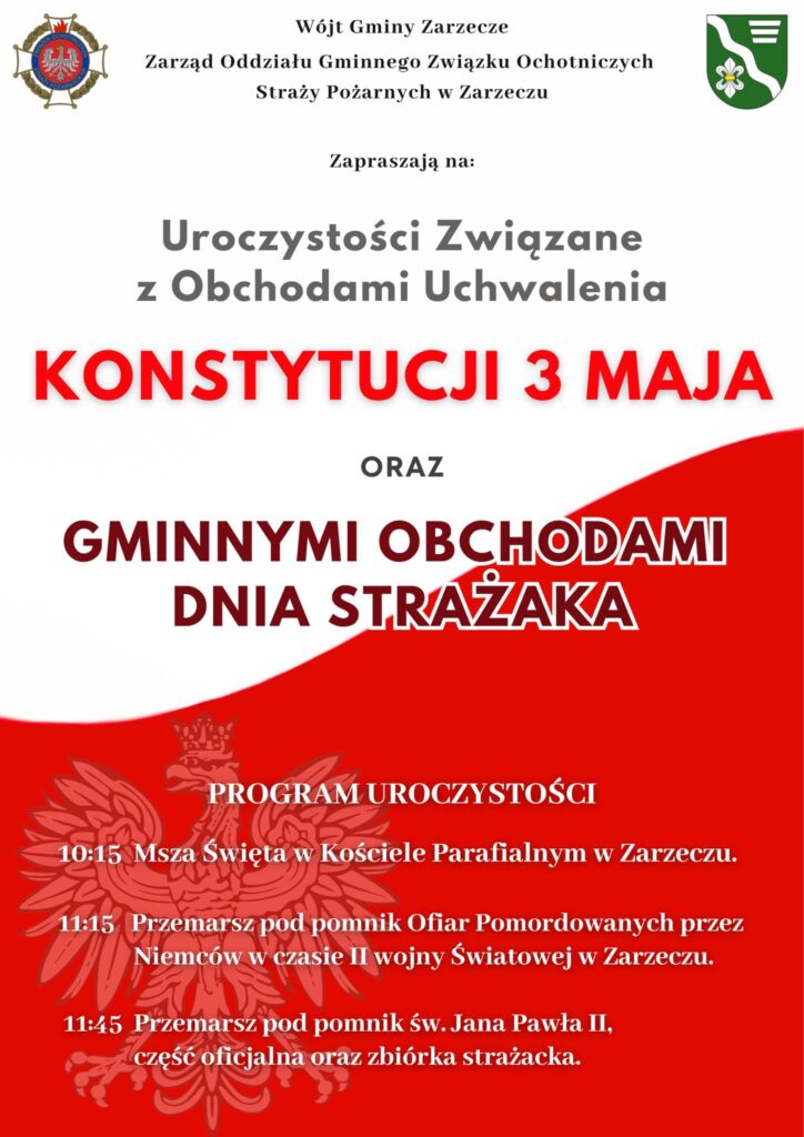 Wójt Gminy Zarzecze Tomasz Bury oraz Zarząd Oddziału Gminnego Związku Ochotniczych Straży Pożarnych w Zarzeczu serdecznie zapraszają Mieszkańców Gminy na uroczyste obchody Uchwalenia Konstytucji 3 Maja oraz Gminny Dzień Strażaka!