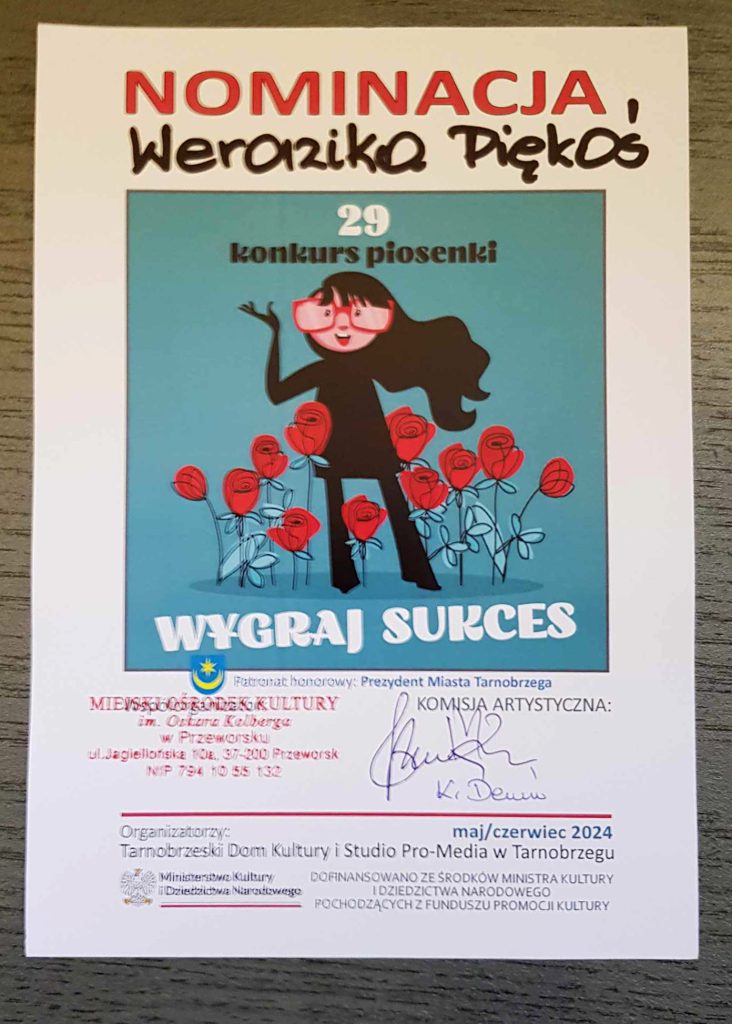 Weronika Piękoś 11 letnia solistka z MOK w Przeworsku pokonała już 2 etapy 29 Ogólnopolskiego Konkurs Piosenki ” WYGRAJ SUKCES” i otrzymała nominację do FINAŁU konkursu , który odbędzie się 26-28 września w Tarnobrzeski Domu Kultury w Tarnobrzegu.