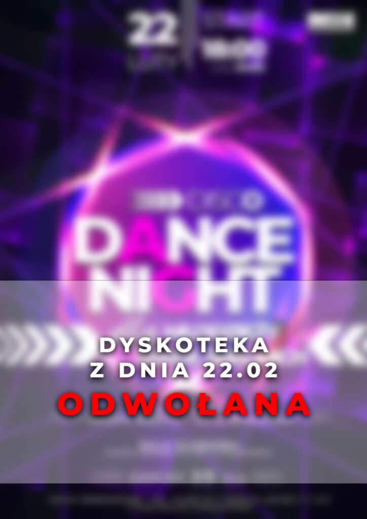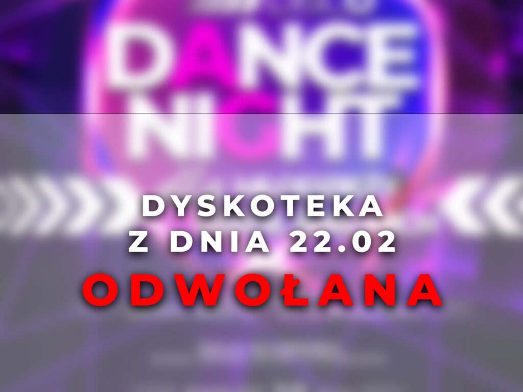 Z przykrością informujemy, że dyskoteka DISCO DANCE PARTY, zaplanowana na 22.02, zostaje odwołana ze względu na niewielkie zainteresowanie.