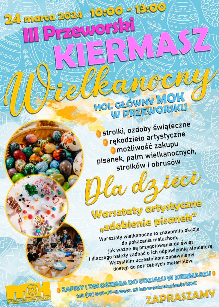 Zapraszamy Państwa na trzeci Przeworski Kiermasz Wielkanocny, który odbędzie się 24 marca 2024 roku w godzinach od 10:00 do 13:00 w holu głównym Miejskiego Ośrodka Kultury w Przeworsku. To wyjątkowe święto w naszym mieście, które połączy tradycję, radość i kreatywność.