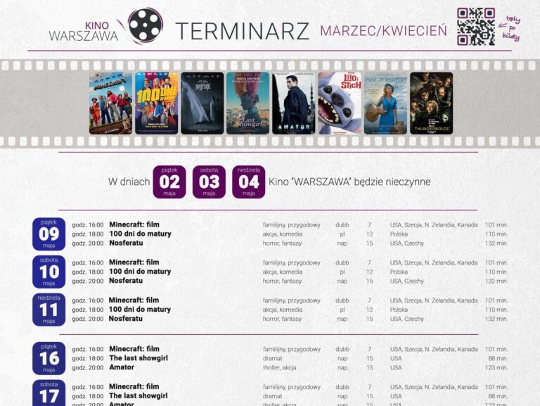 Szczegółowy harmonogram seansów z datami i godzinami dostępny jest na plakacie oraz na stronie internetowej Miejskiego Ośrodka Kultury w Przeworsku. Jak podsumowuje kino, zapowiada się miesiąc pełen wrażeń.