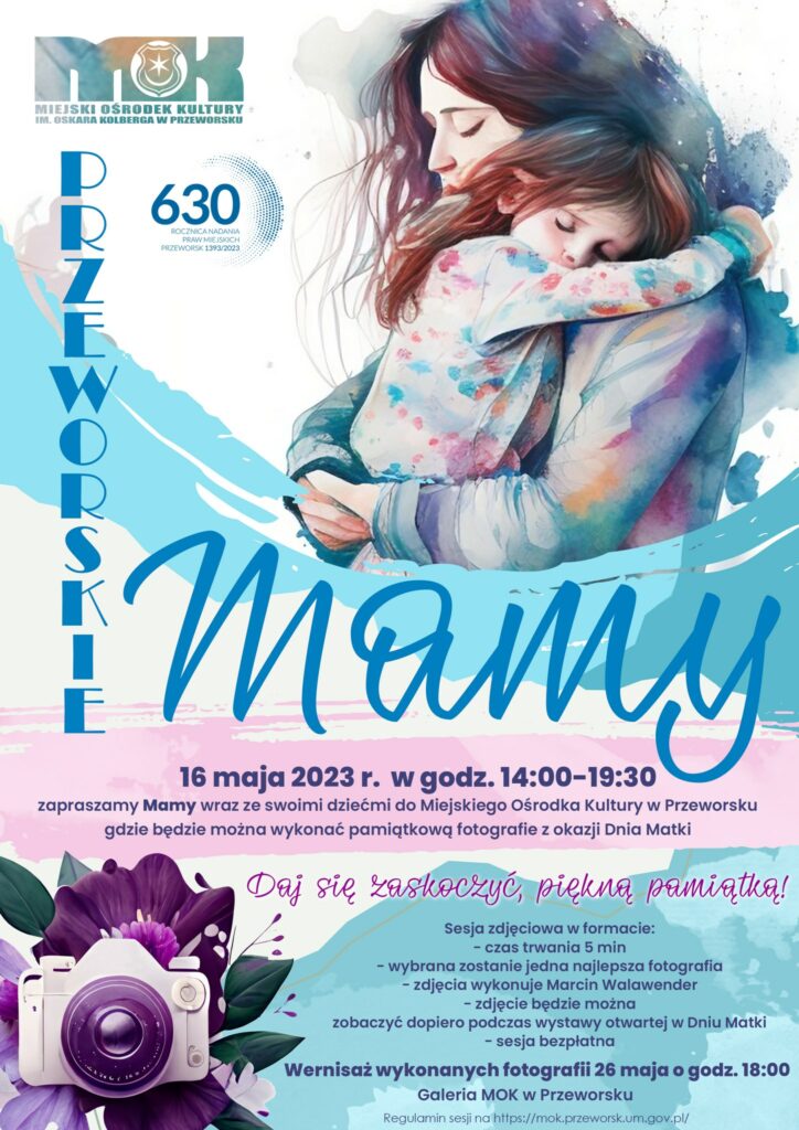 Zdjęcia uczestników sesji będzie można zobaczyć podczas otwarcia wystawy Przeworskie Mamy 26 maja 2023 r. o godz.18:00 w Dniu Matki. Wystawa znajdować się będzie w Galerii Miejskiego Ośrodka Kultury. Format sesji i warunki uczestnictwa w regulaminie: REGULAMIN