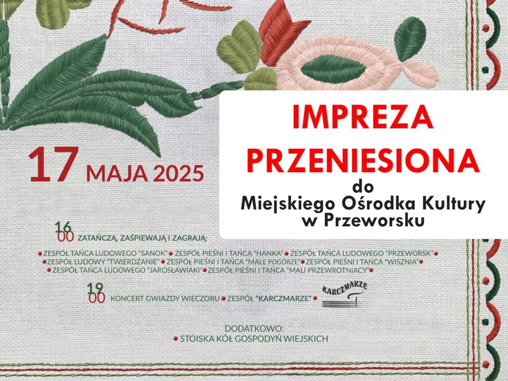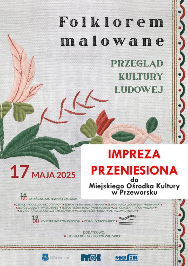 Uwaga miłośnicy folkloru! Zapraszamy na barwne i radosne święto tradycji – Przegląd Kultury Ludowej „Folklorem malowane”, który odbędzie się już jutro, w sobotę, 17 maja 2025 roku, w Miejskim Ośrodku Kultury w Przeworsku!