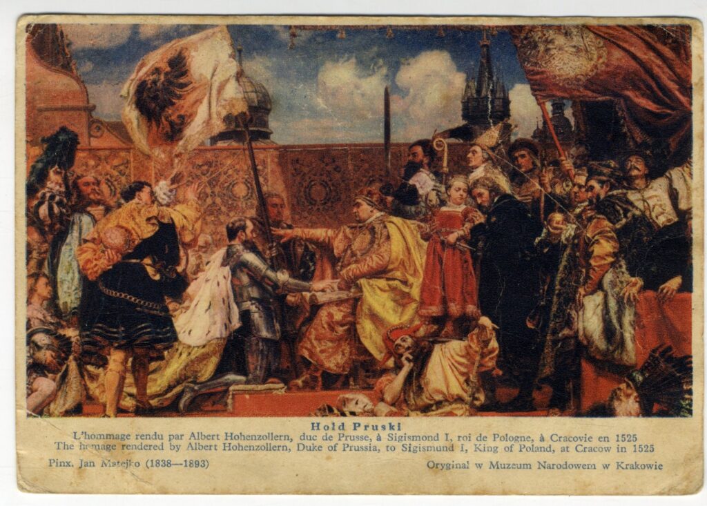 Obraz Matejki przedstawia uroczystość hołdu złożonego Królowi Polski Zygmuntowi I Staremu przez Albrechta Hohenzollerna, wielkiego mistrza zakonu krzyżackiego. Dzieło powstawało w latach 1879–1882 i mierzy ponad 30 m². Oryginał można podziwiać w Galerii Sztuki Polskiej XIX wieku w Sukiennicach w Krakowie. W postacie historyczne Matejko wcielił znanych sobie współczesnych krakowian, m.in. malarza Tadeusza Popiela i hrabiego Stefana Tarnowskiego.