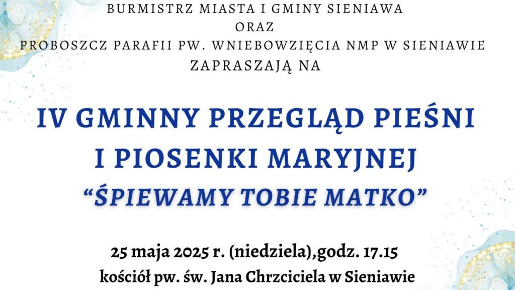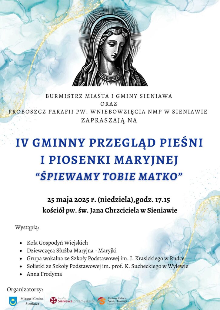 Burmistrz Miasta i Gminy Sieniawa oraz Proboszcz Parafii pw. Wniebowzięcia NMP w Sieniawie serdecznie zapraszają na IV Gminny Przegląd Pieśni i Piosenki Maryjnej „Śpiewamy Tobie Matko”!