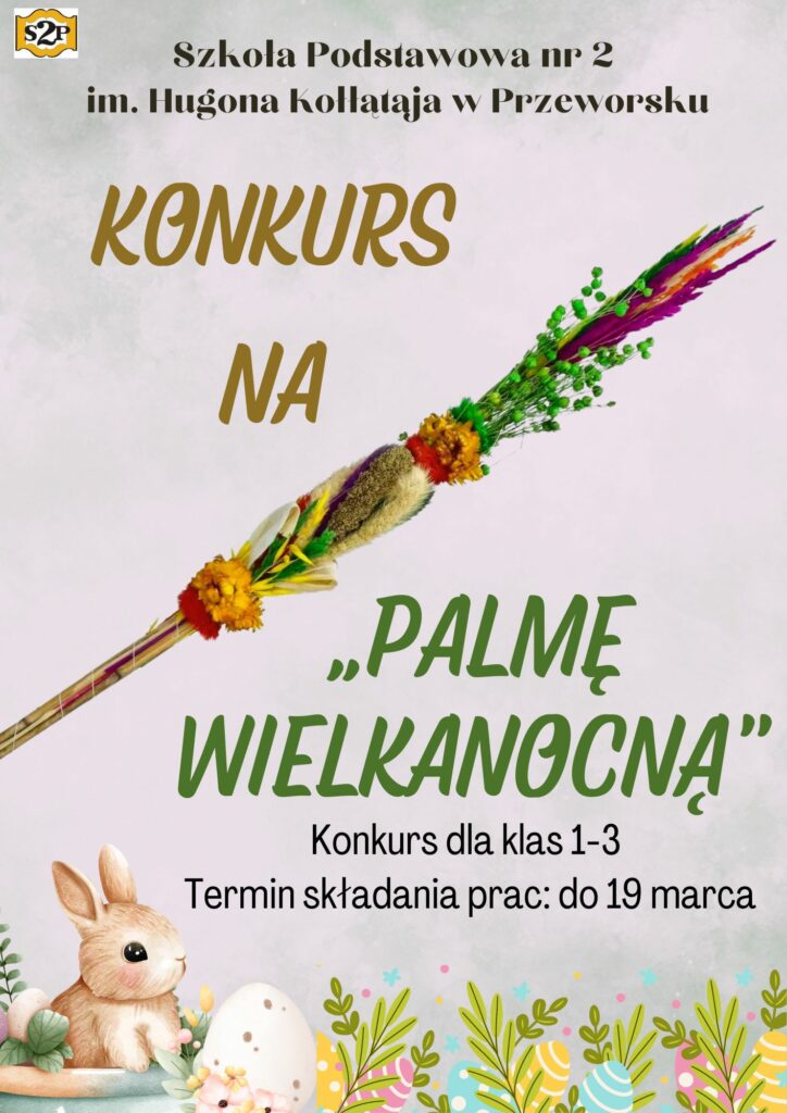 Szkoła podstawowa im. Hugona Kołłątaja nr 2 w Przeworsku zaprasza klasy 1-3 do udziału w konkursie. Uczestnicy mają za zadanie wykonać tradycyjne palmy wielkanocne. Palmy należy dostarczyć najpóźniej do 19 marca (wtorek) 2024 r. do p. Marii Olchowy lub p. Weroniki Motyki. Regulaminy konkursu będą dostępne u wychowawców klas.
