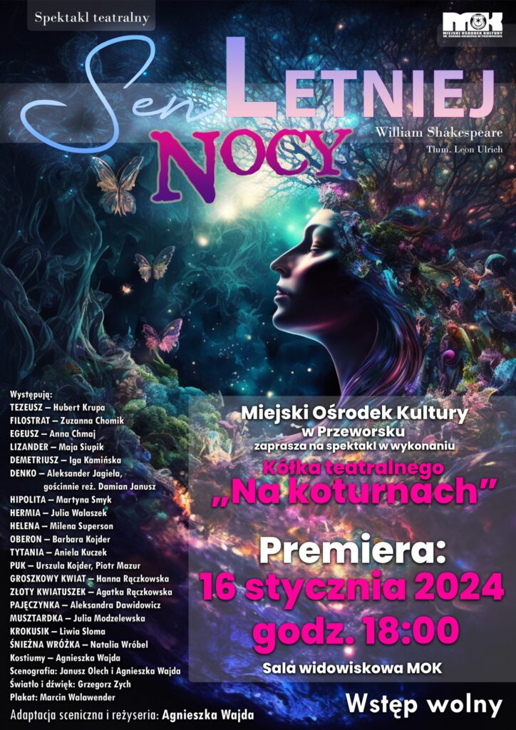 Koło Teatralne Miejskiego Ośrodka Kultury w Przeworsku „Na Koturnach” serdecznie zaprasza na magiczny wieczór pełen śmiechu, romantyzmu i zachwytu, podczas którego ożywiamy ponadczasową klasykę Williama Szekspira „Sen nocy letniej”.