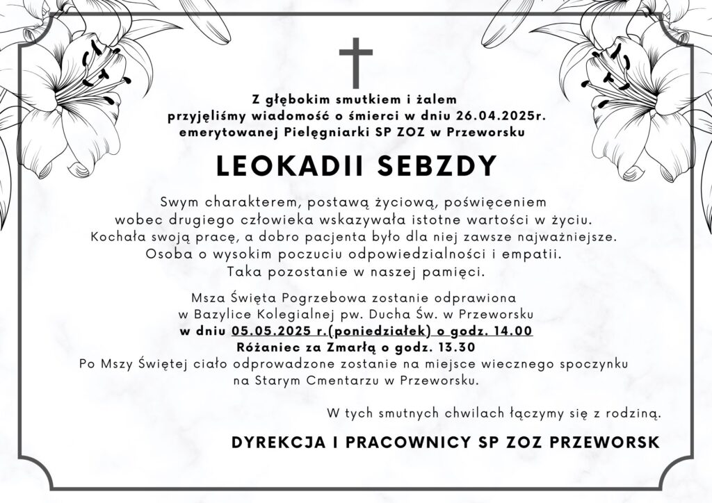 Z głębokim żalem Samodzielny Publiczny Zakład Opieki Zdrowotnej w Przeworsku poinformował o śmierci swojej emerytowanej pielęgniarki, Pani Leokadii Sebzdy, która odeszła 26 kwietnia 2025 roku.