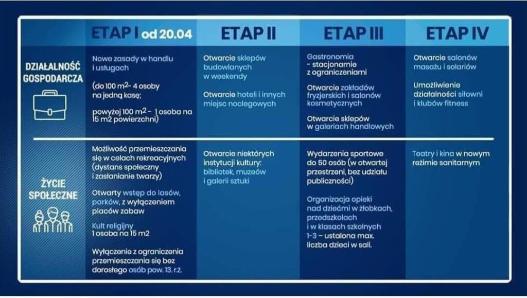 Od poniedziałku nastąpi stopniowe odmrażanie gospodarki. Proces ten ma zachodzić etapami. Jednak nie ściągamy maseczek, oraz nadal zachowujemy odstęp od siebie. Dozwolone są wyjścia rekreacyjne do lasów i parków!