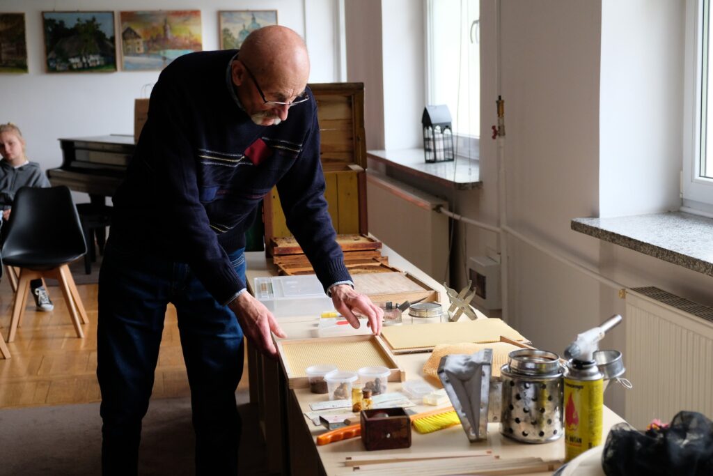Dzieci z zapartym tchem słuchały o tym, jak powstaje słodki miód – od barwnego kwiatu aż po złocisty nektar w słoiku. Poznały hierarchię ula, dowiadując się, jaką rolę pełni każda z pszczelich „rodzin”: pracowite robotnice, trutnie i najważniejsza – królowa matka. Pszczelarze pokazali także, jak wygląda wnętrze ula i jakich narzędzi używają w swojej pracy.