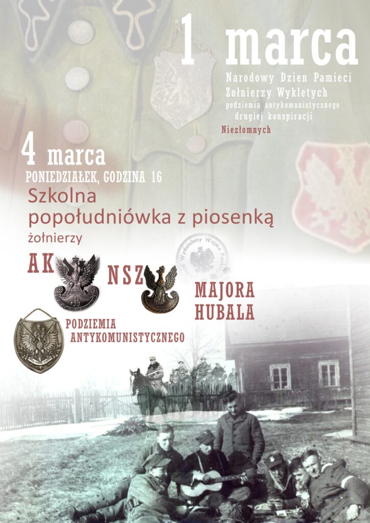 Z okazji Narodowego Dnia Pamięci Żołnierzy Wyklętych, organizujemy 4 marca o godzinie 16 SZKOLNĄ POPOŁUDNIÓWKĘ Z PIOSENKĄ.