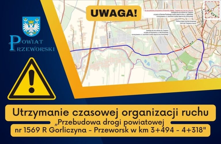 Przedsiębiorstwo Drogowo-Mostowe S.A., generalny wykonawca inwestycji „Przebudowa drogi powiatowej nr 1569 R Gorliczyna – Przeworsk w km 3+494 – 4+318”, informuje o przedłużeniu tymczasowej organizacji ruchu. Zmiany w organizacji ruchu, wprowadzone 19 lipca 2024 roku zgodnie z zatwierdzonym projektem, obowiązywać