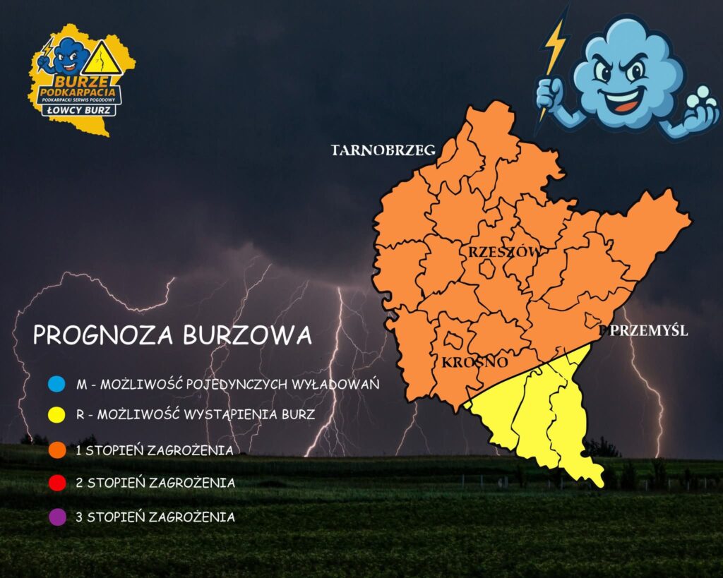 Ryzyko burz dotyczy głównie północnych i centralnych części województwa podkarpackiego, ale lokalnie mogą objąć również obszary południowe. Prognoza obowiązuje od godziny 6:00 w niedzielę, 13 lipca, do godziny 6:00 w poniedziałek, 14 lipca.