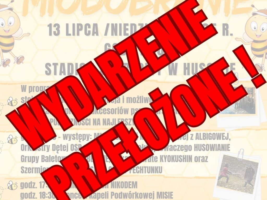 Centrum Kultury Gminy Markowa poinformowało o konieczności zmiany terminu jednej z najbardziej wyczekiwanych letnich imprez w regionie – „IV Husowskiego Miodobrania”. Wydarzenie, które pierwotnie miało odbyć się w najbliższą niedzielę, 13 lipca, zostało przełożone ze względu na niesprzyjające warunki atmosferyczne.