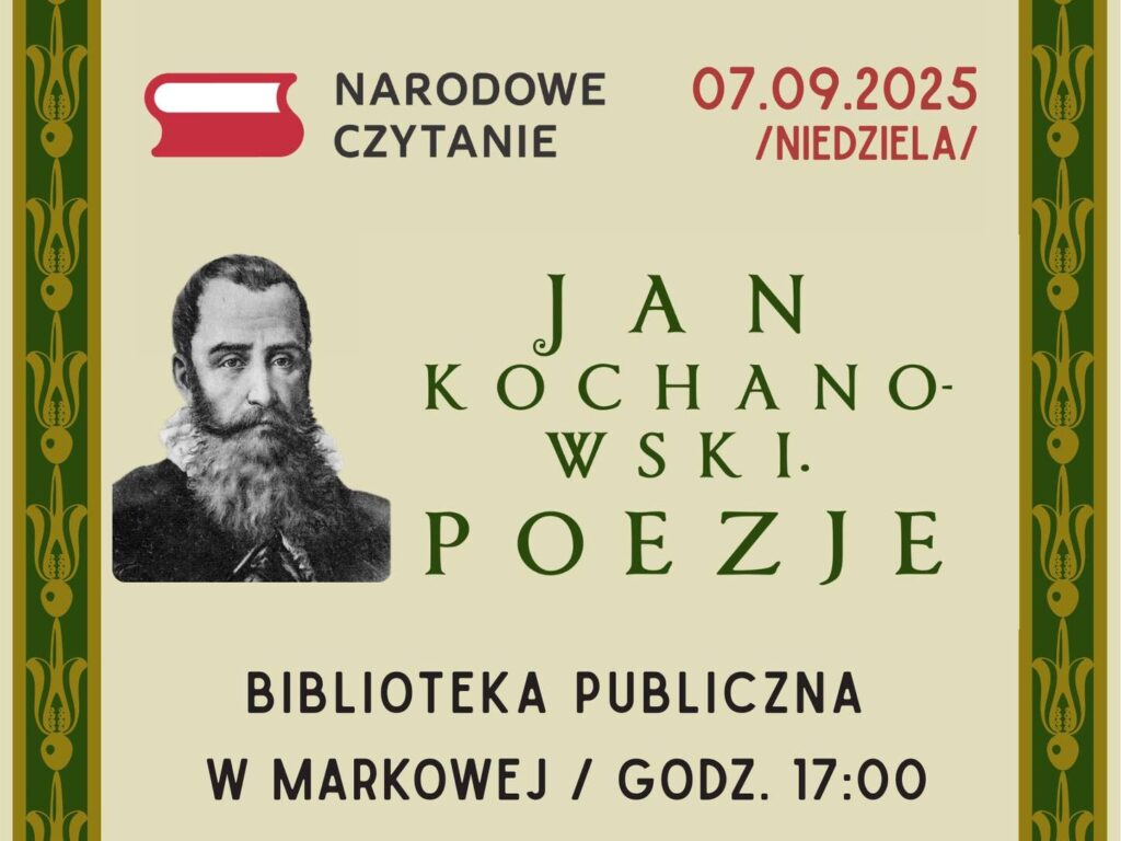 Markowa – Centrum Kultury Gminy Markowa, a w szczególności podległe mu biblioteki, serdecznie zapraszają mieszkańców do wzięcia udziału w tegorocznej edycji ogólnopolskiej akcji Narodowe Czytanie. Wydarzenie, poświęcone twórczości Jana Kochanowskiego, odbędzie się w najbliższą niedzielę, 7 września, w Bibliotece Publicznej w Markowej. Początek o godzinie 17:00.