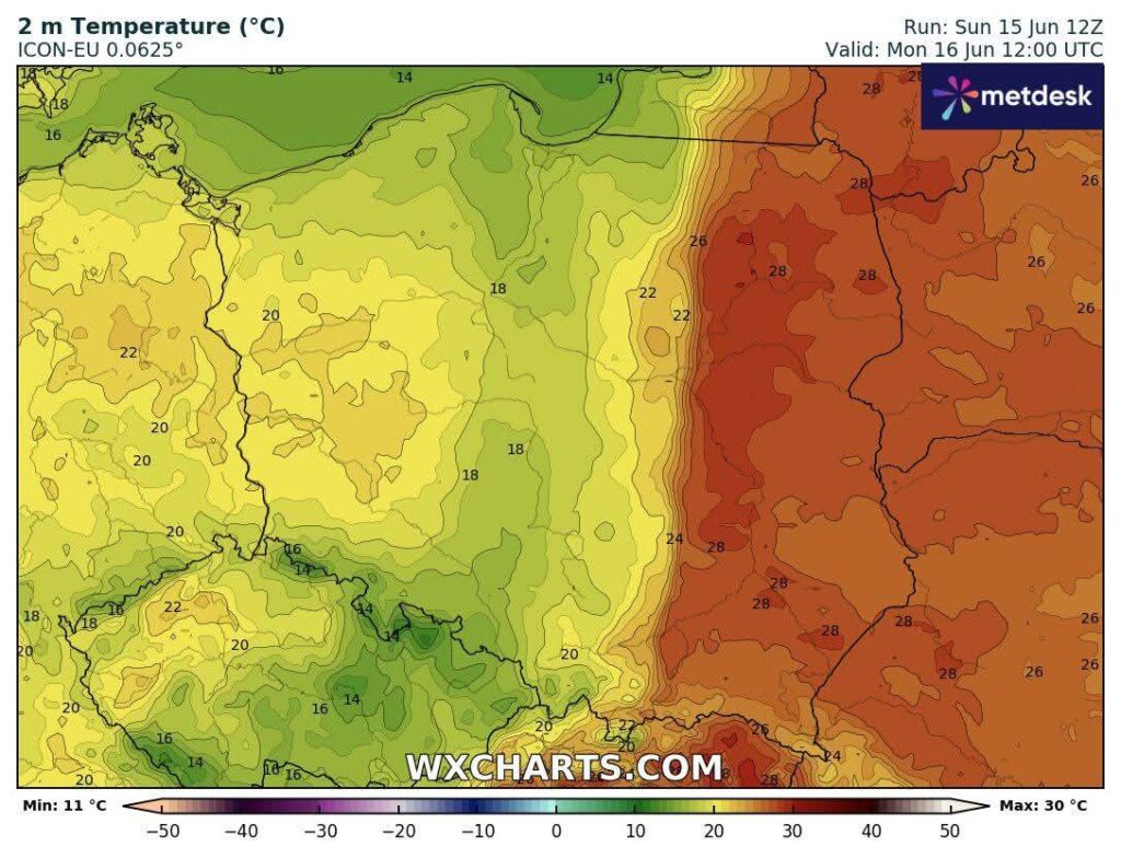 Rozpoczniemy dzień z przewagą bezchmurnego nieba na większości obszaru województwa. Lokalnie może pojawić się niewielkie zachmurzenie. W ciągu dnia zrobi się bardzo ciepło, wręcz upalnie, ze słońcem dominującym na niebie. W drugiej części dnia zachmurzenie zacznie wzrastać, sygnalizując nadejście chłodnego frontu atmosferycznego, który dotrze do nas po południu lub wieczorem. Będzie on jednak na tyle zdegradowany, że ewentualne opady będą raczej słabe i lokalne. Nadejście frontu objawi się wzrostem prędkości wiatru i szybkim spadkiem temperatury. Istnieje marginalna szansa na pojedyncze wyładowania atmosferyczne.