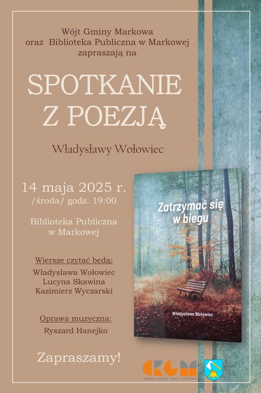 Centrum Kultury Gminy Markowa serdecznie zaprasza na spotkanie z poezją Władysławy Wołowiec, które odbędzie się 14 maja 2025 roku (w środę) o godzinie 19:00 w Bibliotece Publicznej w Markowej.