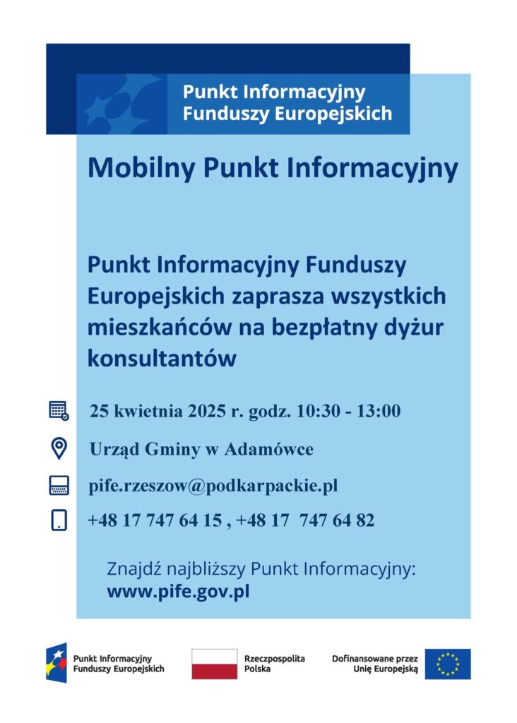 Mieszkańcy Gminy Adamówka i okolic! Już w najbliższy piątek, 25 kwietnia 2025 roku, w Urzędzie Gminy Adamówka odbędzie się bezpłatny dyżur konsultantów Punktu Informacyjnego Funduszy Europejskich! To wyjątkowa okazja, by zdobyć cenne informacje i wsparcie w zakresie funduszy unijnych.