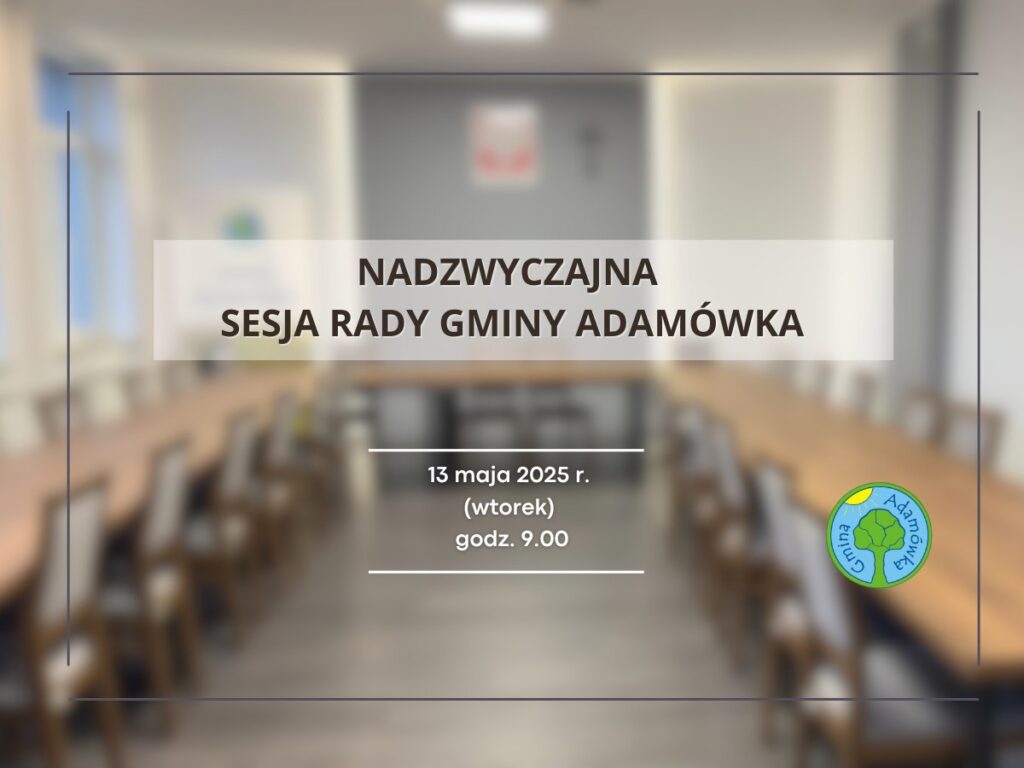 Przewodniczący Rady Gminy Adamówka informuje, że dnia 13 maja 2025 r. (wtorek) o godzinie 9:00 w sali konferencyjnej Urzędu Gminy Adamówka odbędzie się Nadzwyczajna Sesja Rady Gminy Adamówka.