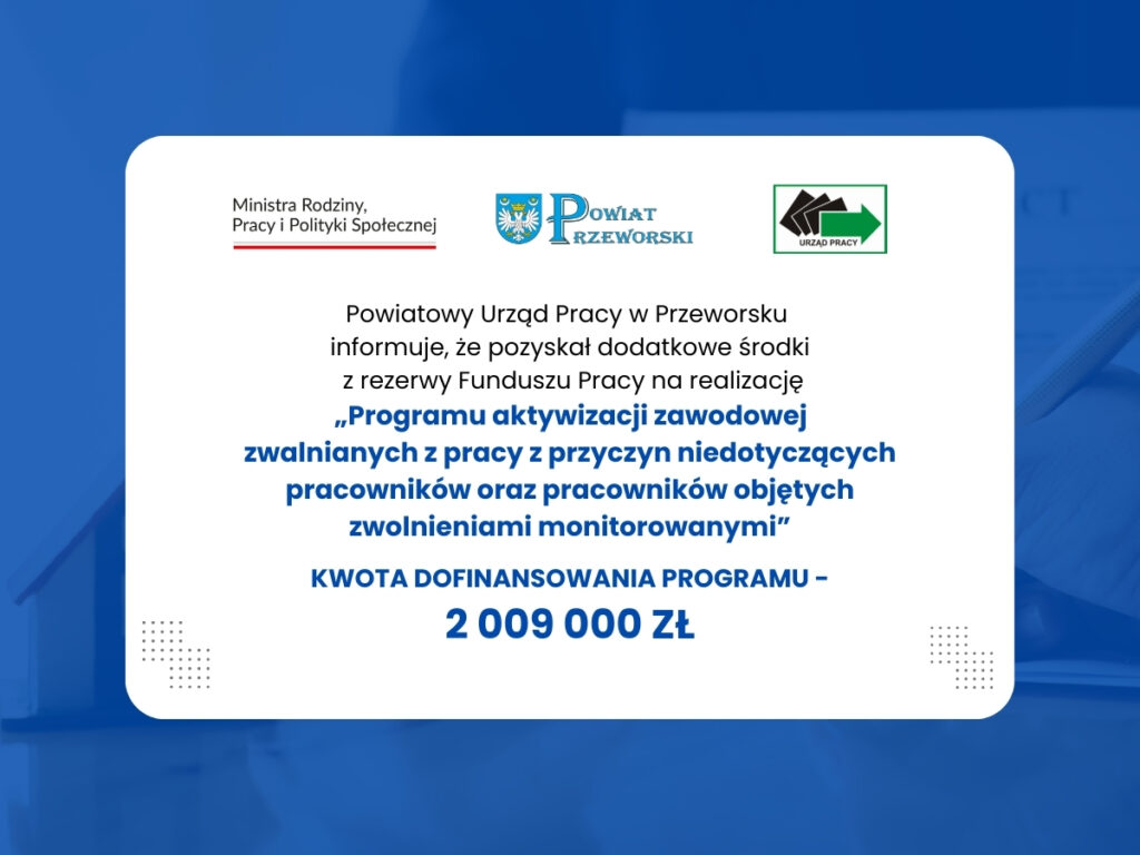 Powiatowy Urząd Pracy w Przeworsku pozyskał dodatkowe środki z rezerwy Funduszu Pracy w wysokości 2 009 000 zł na realizację „Programu aktywizacji zawodowej zwalnianych z pracy z przyczyn niedotyczących pracowników oraz pracowników objętych zwolnieniami monitorowanymi”.