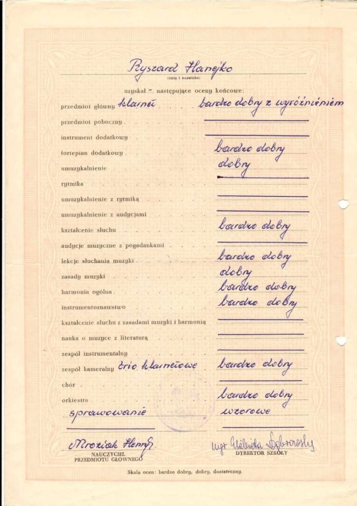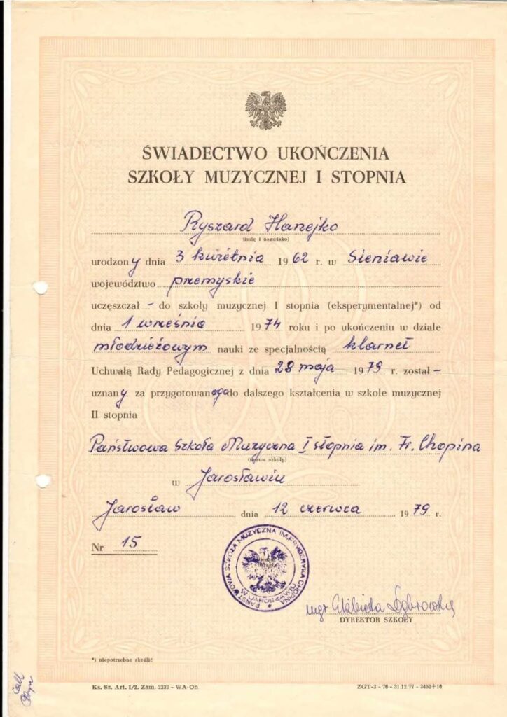 „Edukację muzyczną rozpocząłem w roku 1974, a zakończyłem w 1979 z oceną bardzo dobry i wyróżnieniem z głównego przedmiotu, tj. z klarnetu” – wspomina Kapelmistrz. „Bardzo miło wspominam tamte lata, szczególnie przedmioty muzyczne oraz muzykowanie w kwartecie klarnetowym, w orkiestrze szkolnej, a w szczególności występy na tzw. popisach i różnych koncertach.”