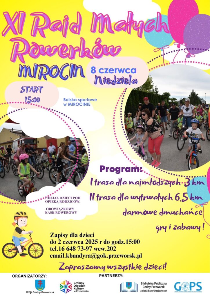 Gminny Ośrodek Kultury w Przeworsku serdecznie zaprasza wszystkie dzieci w wieku od 3 do 12 lat wraz z rodzicami na wyjątkowe wydarzenie – XI Rajd Małych Rowerków w Mirocinie!