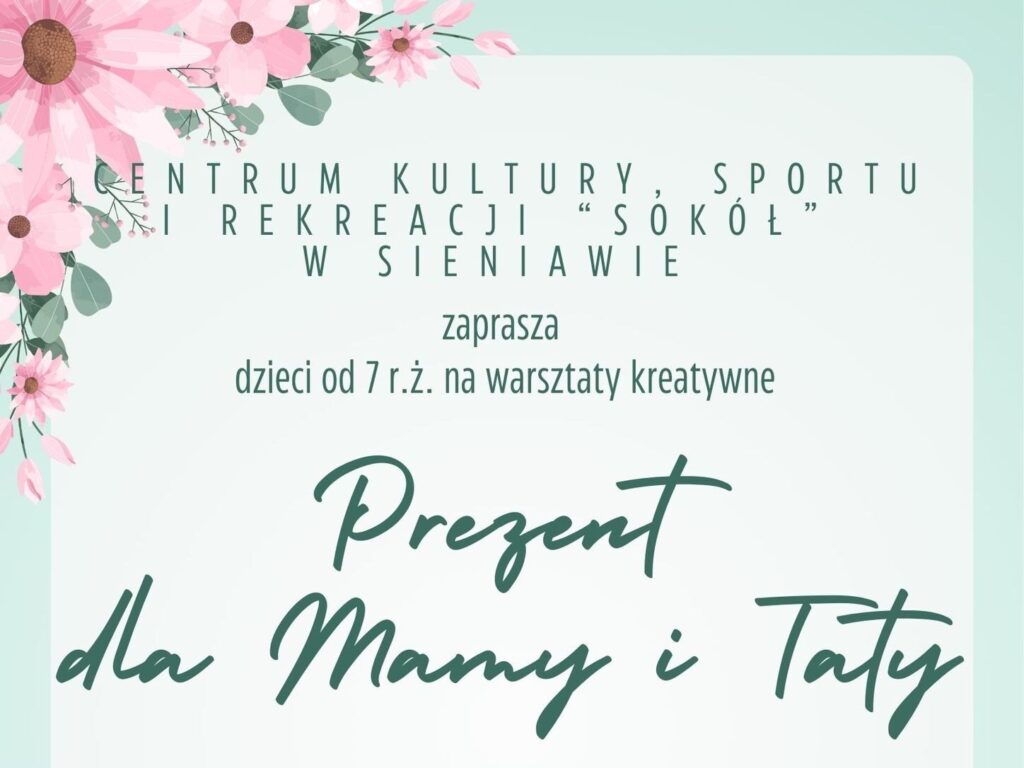 Centrum Kultury, Sportu i Rekreacji „Sokół” w Sieniawie zaprasza wszystkie kreatywne dzieci od 7 roku życia na wyjątkowe warsztaty! Zbliża się Dzień Matki, a zaraz po nim Dzień Ojca – to idealna okazja, by podarować swoim rodzicom coś naprawdę oryginalnego, stworzonego własnoręcznie.