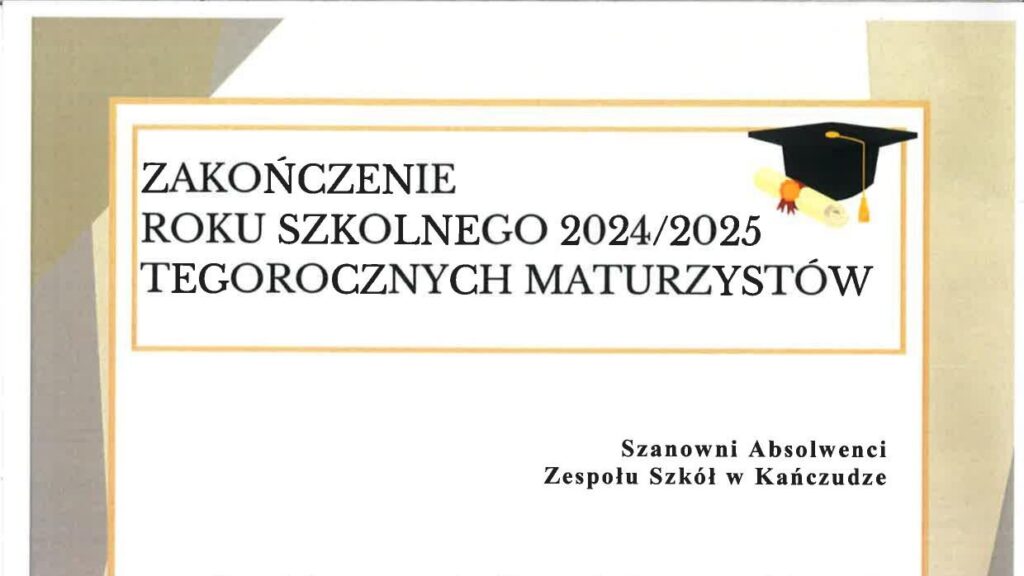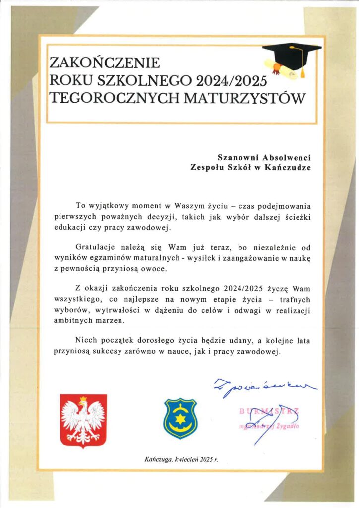 Zakończenie roku szkolnego to zawsze symboliczny moment dla młodzieży, która wkracza w dorosłe życie. Tegoroczni absolwenci Zespołu Szkół w Kańczudze otrzymali wyjątkowe przesłanie od Burmistrza Miasta i Gminy Kańczuga, pana Andrzeja Żygadły. W oficjalnym liście gratulacyjnym burmistrz podkreślił znaczenie tego etapu życia, nazywając go czasem pierwszych poważnych decyzji – o dalszej edukacji czy wyborze ścieżki zawodowej.