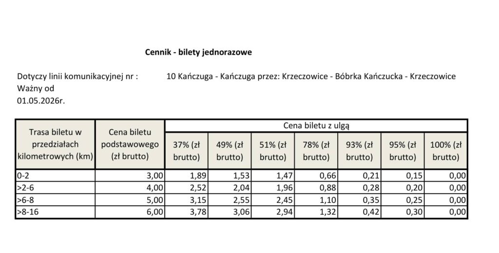 Miasto i Gmina Kańczuga, jako organizator publicznego transportu zbiorowego, poinformowała o zmianach wprowadzanych przez operatora linii nr 10. Obsługą trasy zajmuje się Firma Handlowo-Usługowa Mariusz Freń. Nowe stawki obejmą zarówno bilety jednorazowe, jak i miesięczne, z których korzystają głównie dojeżdżający do szkół i pracy mieszkańcy sołectw Żuklin, Krzeczowice oraz Bóbrka Kańczucka.