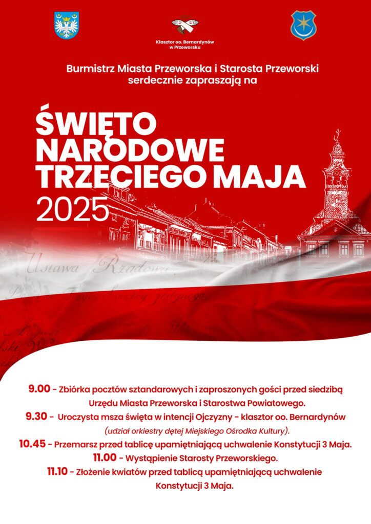 Starosta Przeworski oraz Burmistrz Miasta Przeworska serdecznie zapraszają mieszkańców na uroczyste obchody Święta Narodowego Trzeciego Maja. Wydarzenie odbędzie się w sobotę, 3 maja 2025 roku, w Przeworsku.