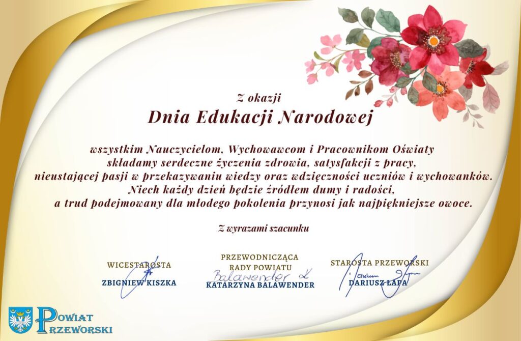 Pod wspólnymi życzeniami podpisali się Starosta Przeworski Dariusz Łapa, Wicestarosta Zbigniew Kiszka oraz Przewodnicząca Rady Powiatu Katarzyna Balawender. W swoich słowach podkreślili, jak ważną i trudną misję pełnią pracownicy oświaty.