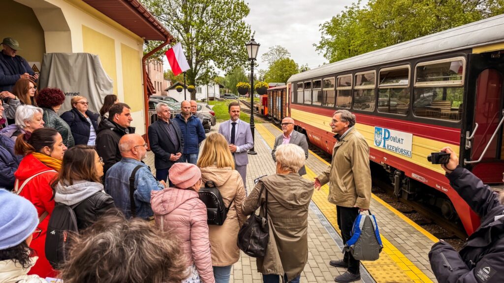 Starosta Przeworski Dariusz Łapa oraz Wicestarosta Zbigniew Kiszka przybliżyli gościom historię kolejki i podkreślali jej znaczenie dla dziedzictwa regionu.