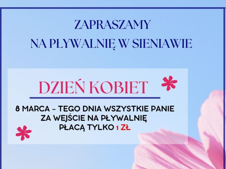 Centrum Kultury, Sportu i Rekreacji w Sieniawie zaprasza na wyjątkowe obchody Dnia Kobiet i Dnia Mężczyzn! Z tej okazji przygotowano specjalną promocję na pływalni. Dzień Kobiet – 8 marca Wszystkie panie, które odwiedzą pływalnię 8 marca, zapłacą za wejście tylko
