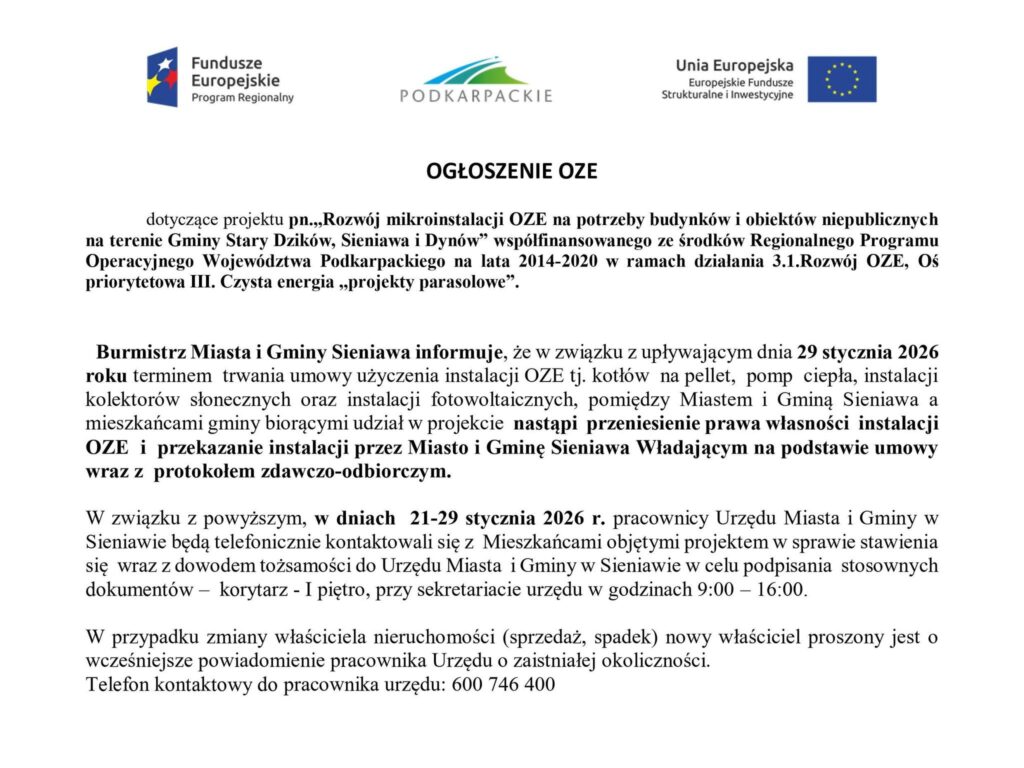 Burmistrz Miasta i Gminy Sieniawa wydał ważny komunikat dla wszystkich mieszkańców, którzy brali udział w projekcie „Rozwój mikroinstalacji OZE na potrzeby budynków i obiektów niepublicznych”. Z dniem 29 stycznia 2026 roku wygasa termin umowy użyczenia instalacji, co oznacza, że zostaną one oficjalnie przekazane na własność mieszkańcom. W związku z tym konieczne jest dopełnienie formalności w urzędzie.