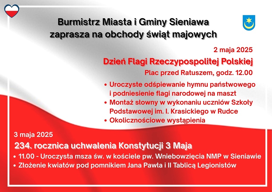 Miasto i Gmina Sieniawa zapraszają mieszkańców do udziału w obchodach świąt majowych. Uroczystości rozpoczną się 2 maja 2025 roku, w Dniu Flagi Rzeczypospolitej Polskiej. O godzinie 12.00 na placu przed Ratuszem zaplanowano oficjalne odśpiewanie hymnu państwowego oraz podniesienie flagi narodowej na maszt. W programie znalazł się również montaż słowny przygotowany przez uczniów Szkoły Podstawowej im. Ignacego Krasickiego w Rudce oraz okolicznościowe wystąpienia.