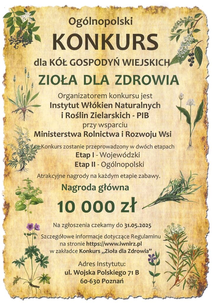 Szczegółowe kryteria oceny, regulamin oraz formularz zgłoszeniowy znajdziecie na stronie organizatora: Instytutu Włókien Naturalnych i Roślin Zielarskich – PIB, w zakładce Konkurs „Zioła dla Zdrowia”.