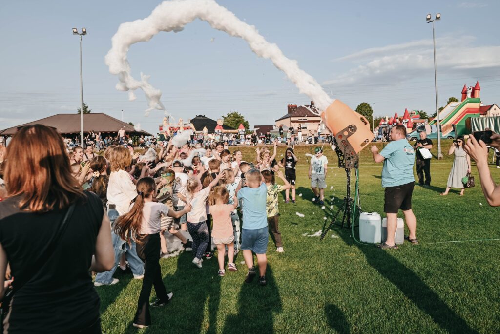 Nie zabrakło również typowo dziecięcych szaleństw – dmuchańce były oblegane przez cały czas, widowiskowe piana party dostarczyło mnóstwo śmiechu, a Festiwal Kolorów zamienił stadion w tęczową eksplozję barw. Sportowych emocji dostarczyły mecze młodych piłkarzy, którzy z zapałem walczyli na boisku.
